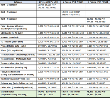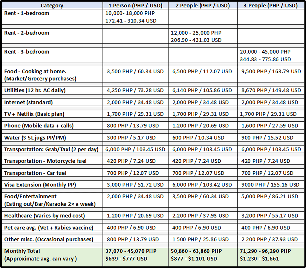 The table below will help you navigate the 2026 cost of living in Dumaguete and the surrounding areas. Please keep in mind that this can vary depending on lifestyle. For instance, food consumption, medical needs, and the amount of travel and entertainment you desire may play a factor in higher costs. The table should give you a good base in regards an average cost of living, and you can adjust it according to your needs.